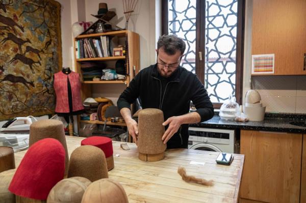 2023年12月17日,科尼亚,尤努斯·吉吉格在一个车间工作,用模具制作具有象征意义的帽子Sikke。(图片来源:Ozan Kose /法新社)
