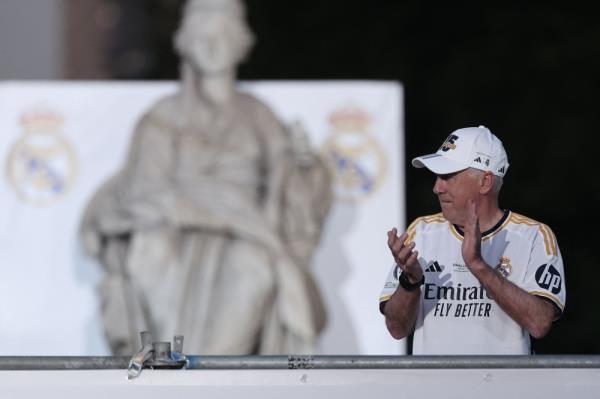 2024年6月2日,皇家马德里队的意大利教练安切洛蒂在马德里的西贝莱斯广场庆祝他们在伦敦击败多特蒙德后的第15次欧冠胜利。(图片来源:Thomas Coex /法新社)