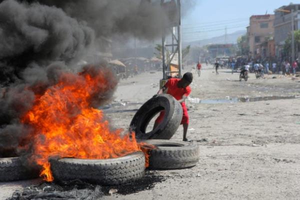 资料图片:2023年1月26日,海地太子港,一名示威者在抗议最近武装团伙杀害警察的抗议活动中,将轮胎移向燃烧的路障。路透社/拉尔夫·泰迪·埃罗尔/资料图