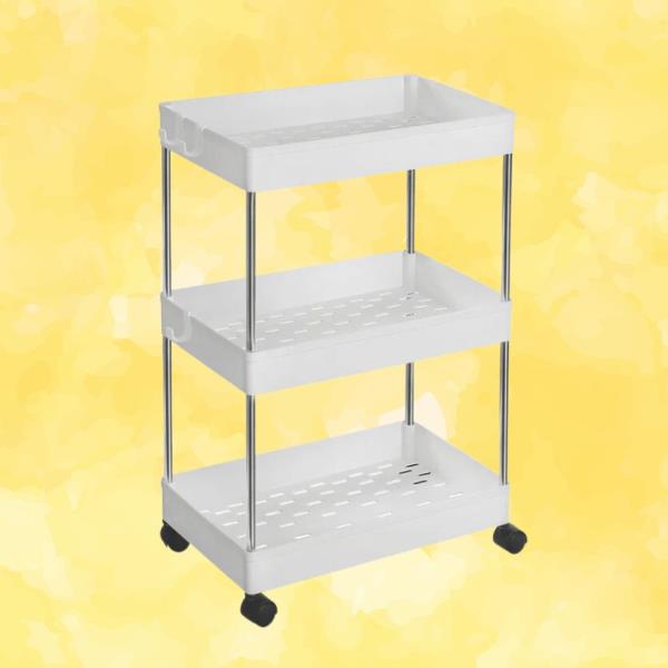 添加一个流行的颜色,这个粉红色的多功能车来自亚马逊(也有黑色或白色为那些喜欢更微妙的氛围)。它有宽敞的架子,底部是网状的,还有一个三角形的架子