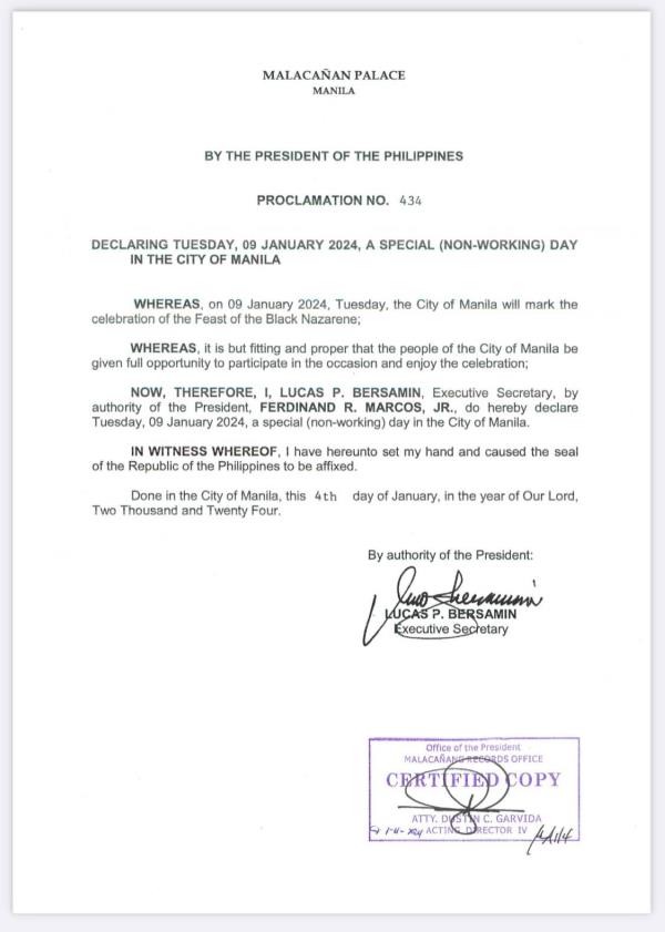 马尼拉,菲律宾:周四,马拉坎南宫发布了第434号公告,宣布2024年1月9日为马尼拉市的一个特殊非工作日,为庆祝黑色拿撒勒人的节日让路。
