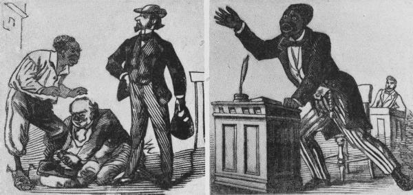 1868年,南卡罗来纳州成为第一个拥有黑人占多数的立法机构的州。但是,黑人管理这个州的事实让南方人感到不安,他们开始传播南卡罗来纳州立法机构的图像,意在相互恐吓。普林斯顿大学图书馆收藏的一幅这样的图像将黑人立法者描绘成不识字的人,他们不纳税,但却有权向该州的白人征税。