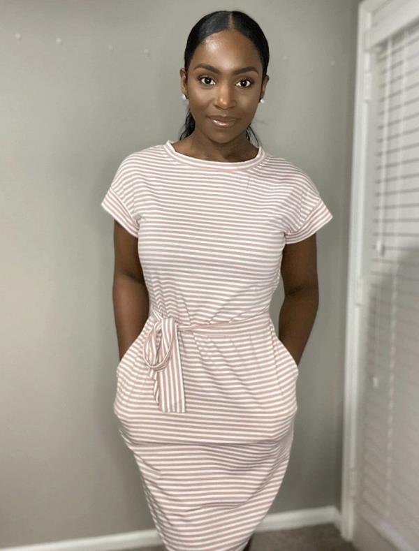 - 一件短袖t恤连衣裙,系腰带和口袋