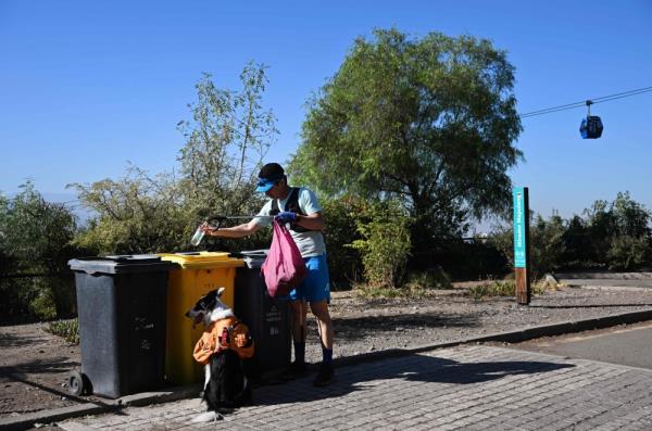 运动员和律师走吧2024年3月12日,在圣地亚哥的圣克里斯托瓦尔营地,纳萨洛·蒋在宠物山姆的陪同下,将塑料瓶放入回收站。罗德里戈·阿兰瓜/法新社摄