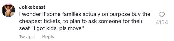 “我认为(TikTok)的音频‘去他们的孩子,也去你的’很有趣,这就是为什么我认为它与这种情况有关。但是,说实话,我以前也和别人换过座位(我甚至把多余的座位让给了一个非常高的男人,以换取一个普通的座位——在接下来的10个小时里,当我蜷缩在较小的空间里时,我确实后悔了那个决定)。”