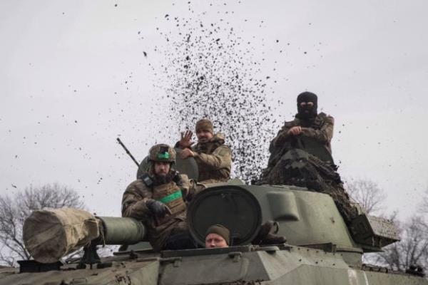 2023年2月27日,乌克兰前线城市巴赫穆特附近,随着俄罗斯对乌克兰的攻击继续,乌克兰军人骑着自行榴弹炮。路透社资料图