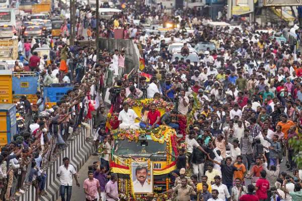 送葬者在道路两旁排起了长队,一辆装饰精美的卡车载着遗体从滨海海滩附近的岛屿广场(Island Grounds)缓慢行进,前往位于科扬贝杜(Koyambedu)的DMDK总部。