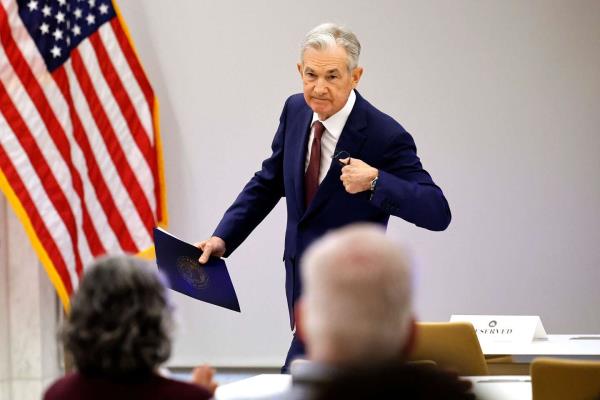 airman Jerome Powell departs after delivering remarks to The Federal Reserve's Division of Research and Statistics Centennial Conference on November 08, 2023 in Washington, DC.">