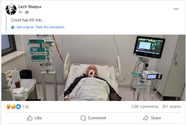瓦文萨在Facebook页面上发布的一篇帖子显示,他戴着氧气面罩躺在病床上,并配文说:“我被新冠肺炎击中了。”