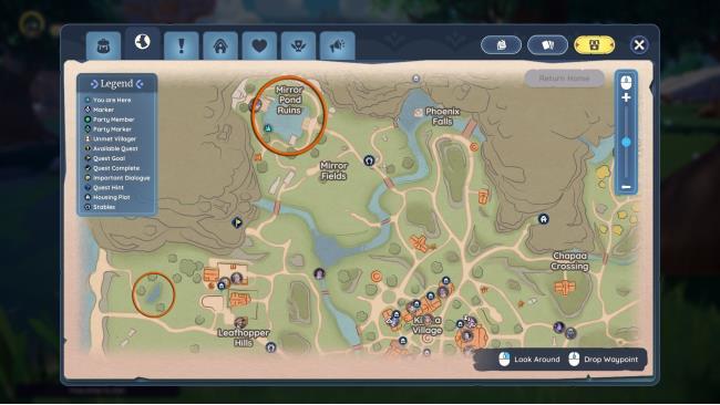 Palia Kilima Village map marked with pond locations circled, showing Mirror Pond Ruins and a pond near Leafhopper Hills.