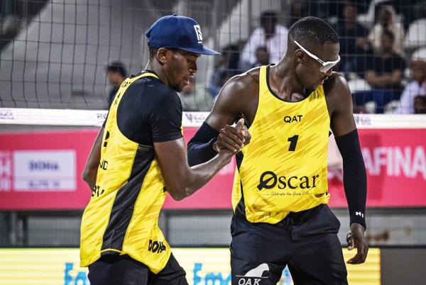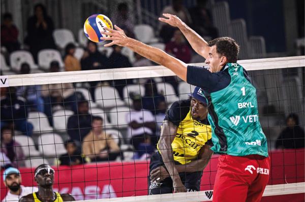 在D组的最后一场比赛中,卡塔尔组合以2:1(19- 21,21 - 15,15 -10)击败了波兰组合迈克尔·布里尔和巴托什·洛西亚克,进入淘汰赛阶段。这对前世界排名第一的组合在周三的首场比赛中输给了意大利的科塔法瓦·塞缪尔和尼科莱·保罗,之后又击败了美国的切斯·巴丁格和迈尔斯·埃文斯。右:昨天比赛中的动作。