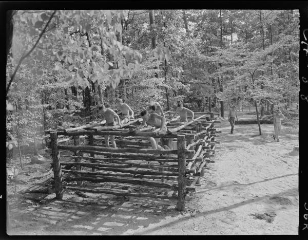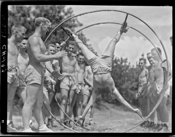除了传统的体育项目(包括一支由当时最好的球员组成的棒球队,包括泰德·威廉姆斯),还有一些体能挑战,比如航空轮,这是一种有时在表演艺术马戏团使用的巨大轮子,学员们把脚绑在上面,然后滚进来,以提高平衡、协调和核心力量。