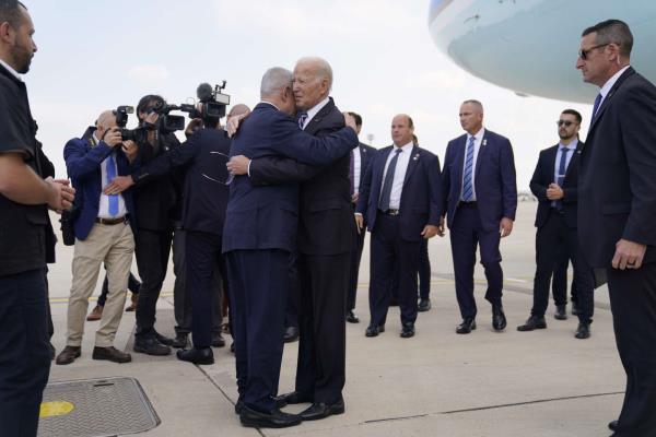 美国总统乔·拜登(Joe Biden)试图倾听以色列的声音,并微妙地警告以色列总理本雅明·内塔尼亚胡(Benjamin Netanyahu)在加沙发动地面进攻的风险,但他正在走钢丝。拜登与阿拉伯领导人的峰会被取消后,美国总统于10月18日星期三抵达以色列,对特拉维夫进行快速访问。以色列总理本雅明·内塔尼亚胡亲自在停机坪上欢迎拜登,他搂着美国总统拜登,拜登随后与内塔尼亚胡握手,以示两国领导人之间新建立的纽带。拜登和内塔尼亚胡在警卫的护卫下,在本古里安机场的停机坪上短暂交谈,随后他们的车队出发前往特拉维夫的一家酒店,他们将在那里举行会谈。