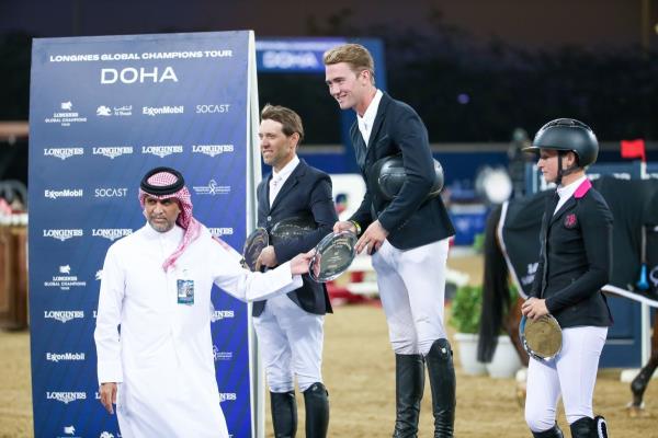 青年党采购总监Nasser Ali Al Kuwari向英国的Oliver Fletcher颁发了CSI5* 2阶段145万美元的冠军奖杯。