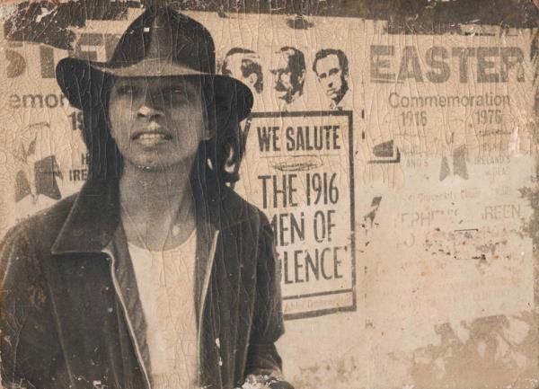 Salleh Ben Jo<em></em>ned in a so<em></em>ngkok and cane, posing in front of a photo of Charlie Chaplin. Photo: Salleh Ben Jo<em></em>ned Literary Legacy Project