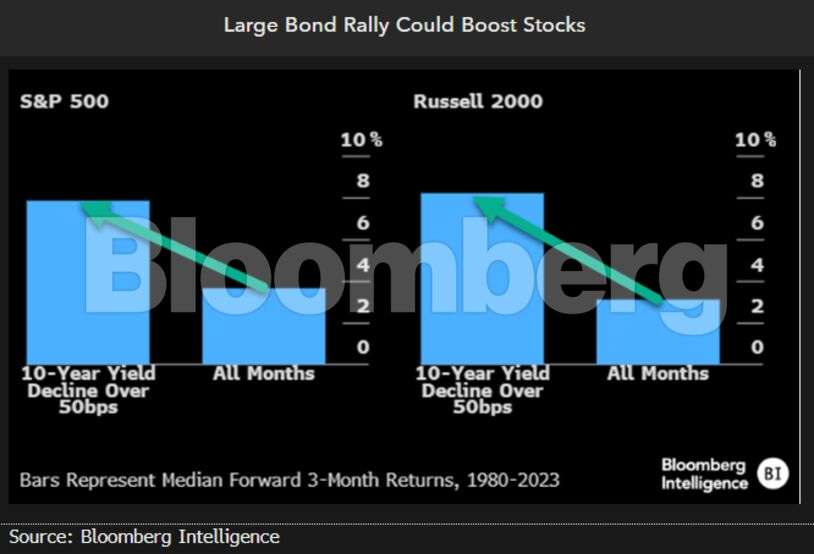 彭博资讯(Bloomberg Intelligence)的克里斯托弗?凯恩(Christopher Cain)汇编的数据显示,自1980年以来,10年期美国国债收益率在一个月内下跌50个基点或更多的情况有33次。标准普尔500指数随后三个月的预期回报率中值接近8%,罗素2000指数为8.2%。