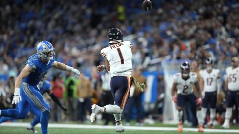 在比赛还剩2分51秒时,芝加哥公牛队在26分的情况下面对3 + 9,以26比21领先活塞队。菲尔兹在交叉路线上寻找顶级接球手DJ摩尔,但底特律的深层安全移动到帮助掩护它。