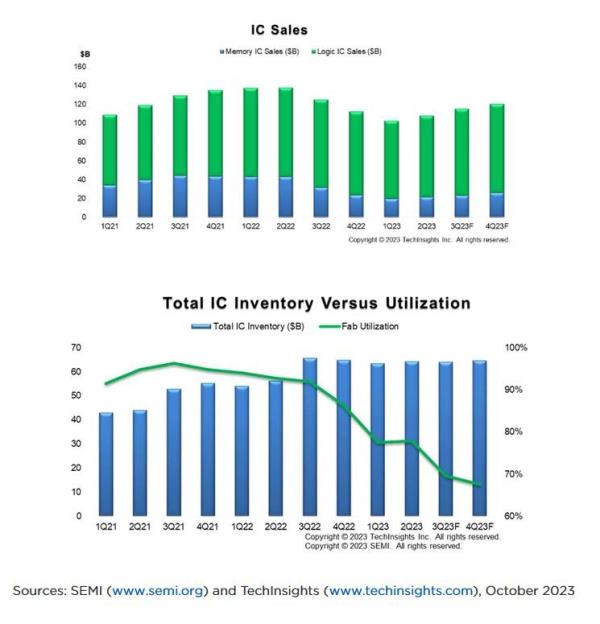 “尽管电子产品和集成电路销售有所改善,但半导体制造指标仍然疲软。今年下半年,晶圆厂的利用率和资本支出继续下降。