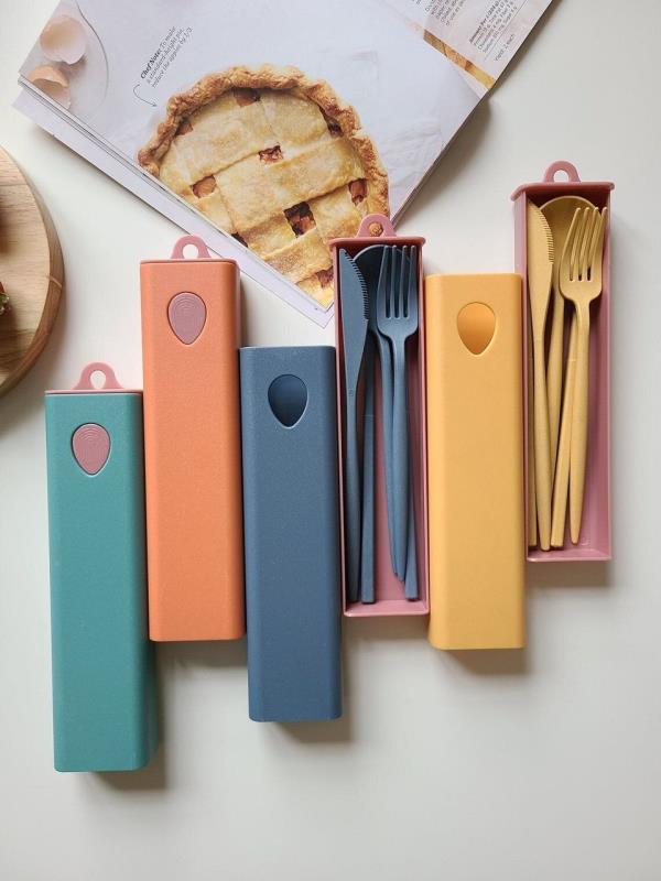一套无塑料餐具套装包括叉子、勺子、锯齿刀和一双筷子。生态天堂商品是一家迈阿密巴