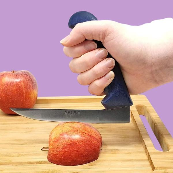 作为治疗师,这款自适应不锈钢和洗碗机安全刀允许用户单手安全地切片和切割食物,并可以减少手指和手腕的压力。