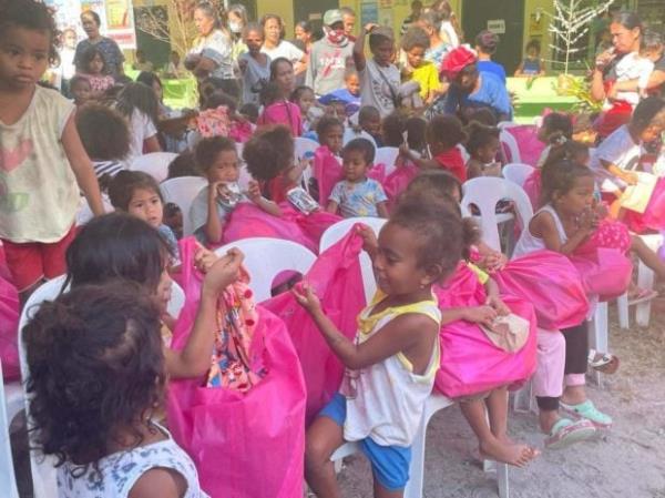 周四(12月22日),洛杉矶市萨班巴托Aeta村的约200名儿童从基地转换与发展局的工作人员那里收到了装有食物、玩具、衣服和书籍的礼物袋。(图源:Tonette Orejas)